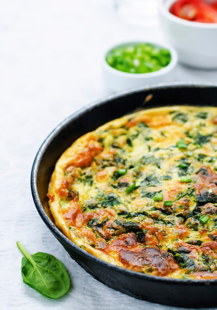 Em uma panela, aqueça metade do azeite e refogue a cebola. Junte o espinafre e refogue por mais 3 minutos. Coloque a noz moscada e o sal e reserve. À parte, bata os ovos com um garfo e junte um pouco de sal, a salsa e a cebolinha. Coloque em uma frigideira antiaderente untada com o restante do azeite e leve ao fogo por 2 minutos. Espalhe o espinafre sobre o ovo ainda mole e deixe por mais alguns minutos. Dobre ao meio e sirva em seguida.